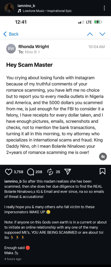 Reacting to the allegation, Ninalowo shared a screenshot of the email on his verified social media page. He clarified that he has never been involved in any romance scam and urged fans to avoid falling victim to fraudsters who impersonate him online.